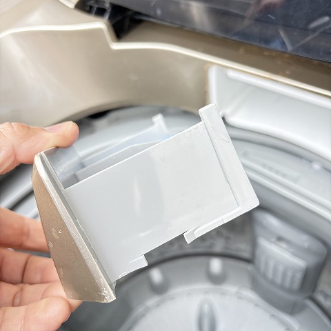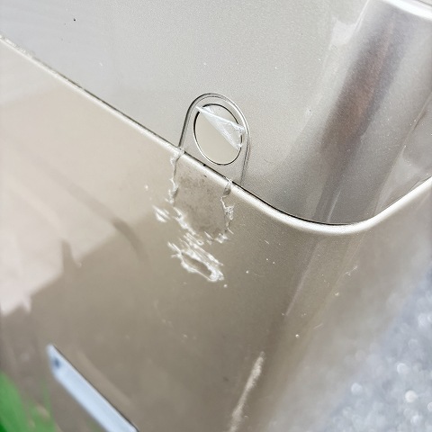 洗剤ケースの塗装がはがれております。これは洗剤・柔軟剤によって、塗装が荒れてしまうようです。洗剤ケースの樹脂部分が片側割れております。脱着時に少し引っ掛かりがありますが、ケースが外れるなどの動作に支障などありません。当店倉庫で3年以上は在庫していたので実際の使用は約2年ぐらいだと思います。