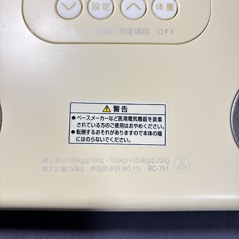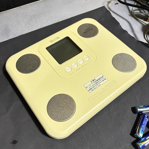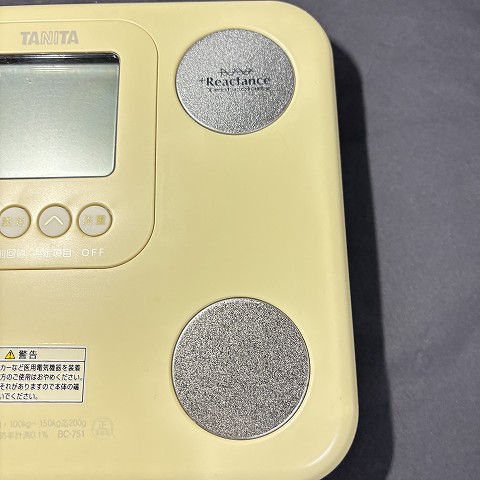 タニタ 体組成計 インナースキャン BC-751 税込1000円 2025年8月28日 商品コード Z008 メーカー名 タニタ 型式 BC-751 年式 おそらく2016年ごろ 寸法 幅260mm × 高さ33mm × 奥行216mm 約880g 状態 樹脂部分は日焼けのため、黄色く変色しております 販売価格 税込1000円 付属品 なし ※電池は付属しません 清掃・動作確認 拭き清掃済 エアーブロー清掃済 アルコール消毒済 動作・使用テストOK 備考 この体組成計は、コンパクトで軽量な設計が特徴です。A4サイズ 単4形乾電池4本 必要説明書はネットにて閲覧ください 戻る