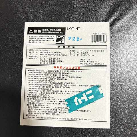 折りたたみチェア ニトリ 税込1000円 2025年9月1日 商品コード M007 メーカー名 ニトリ 型式 XB2 年式 不明 寸法 幅44.5×奥行46×高さ76.5cm 座面の高さ 47cm 状態 細かい傷などありますが、おおむね良好です 販売価格 税込1000円 付属品 なし 清掃・動作確認 拭き清掃済み 備考 戻る